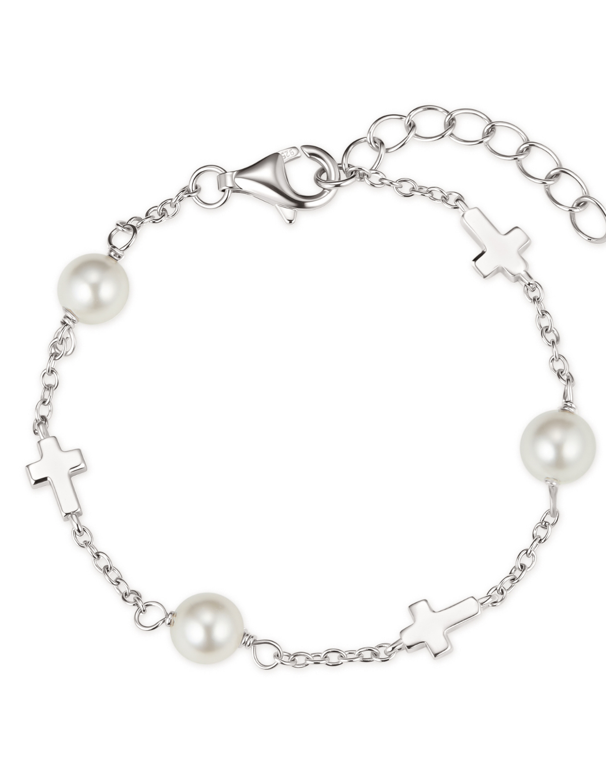HSBR046CElegant sterling silver belcher bracelet crafted for First Holy Communion celebrations. Features alternating white pearls and delicate cross charms, symbolizing faith and grace.