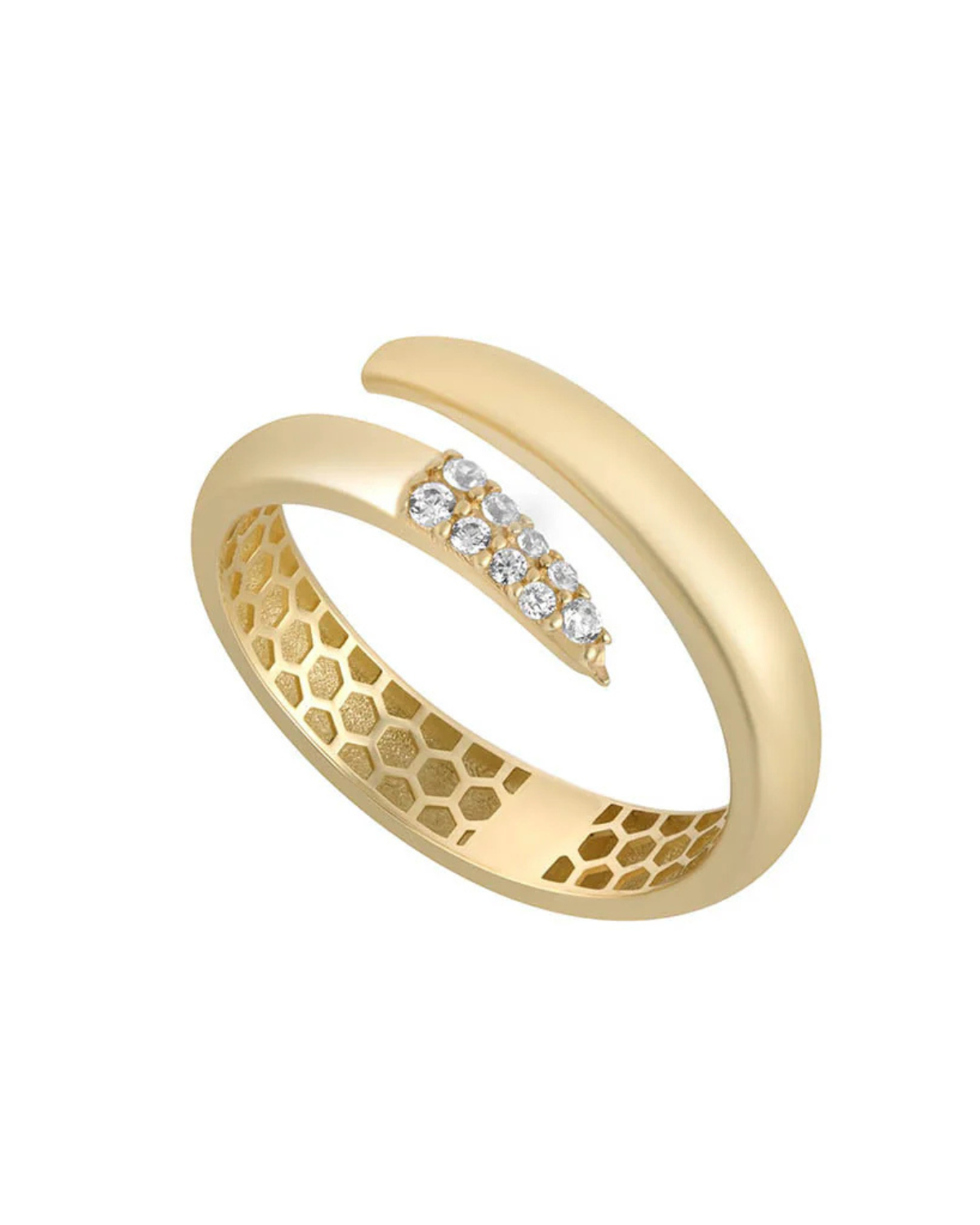 NG2082/JThis gold CZ pointed wrap ring is a unique and eye-catching piece. Its bold design makes it a statement piece for any outfit. Made from 9ct gold so that you can wear, and rewear it.