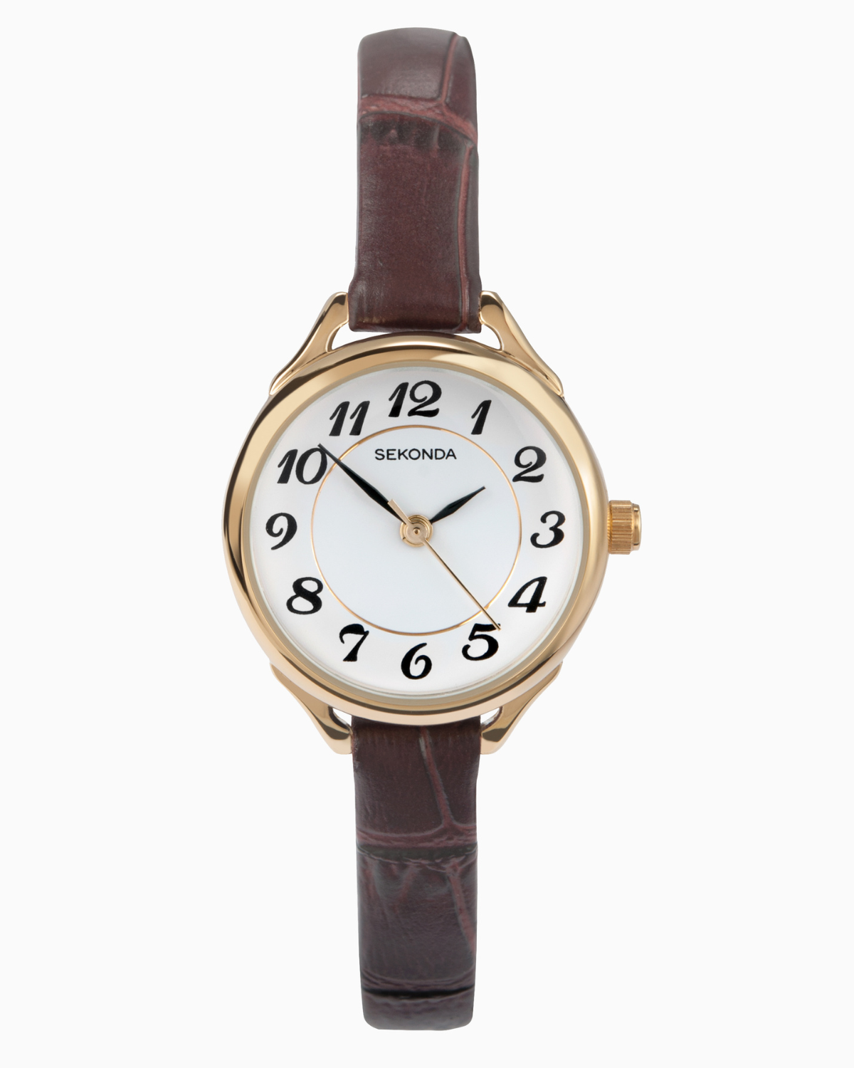 The timepiece features a round gold plated case housing a white dial. The watch is fastened with a brown leather strap that is comfortable on the wrist.