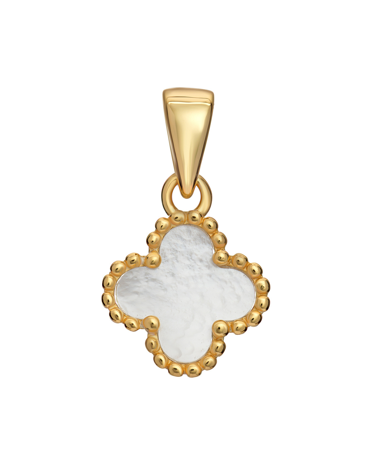 Elegant sterling silver clover pendant adorned with lustrous white mother of pearl, finished with refined gold plating for enhanced warmth and sophistication.