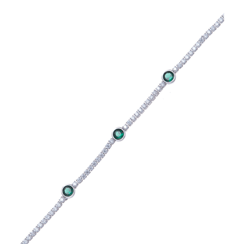 SBR132CThis elegant sterling silver tennis bracelet showcases a continuous line of brilliantly faceted cubic zirconia stones secured in precision claw settings, creating exceptional sparkle and light reflection. Three luminous green stones anchored in rub-over settings form a striking centrepiece, adding distinctive colour and visual interest.
