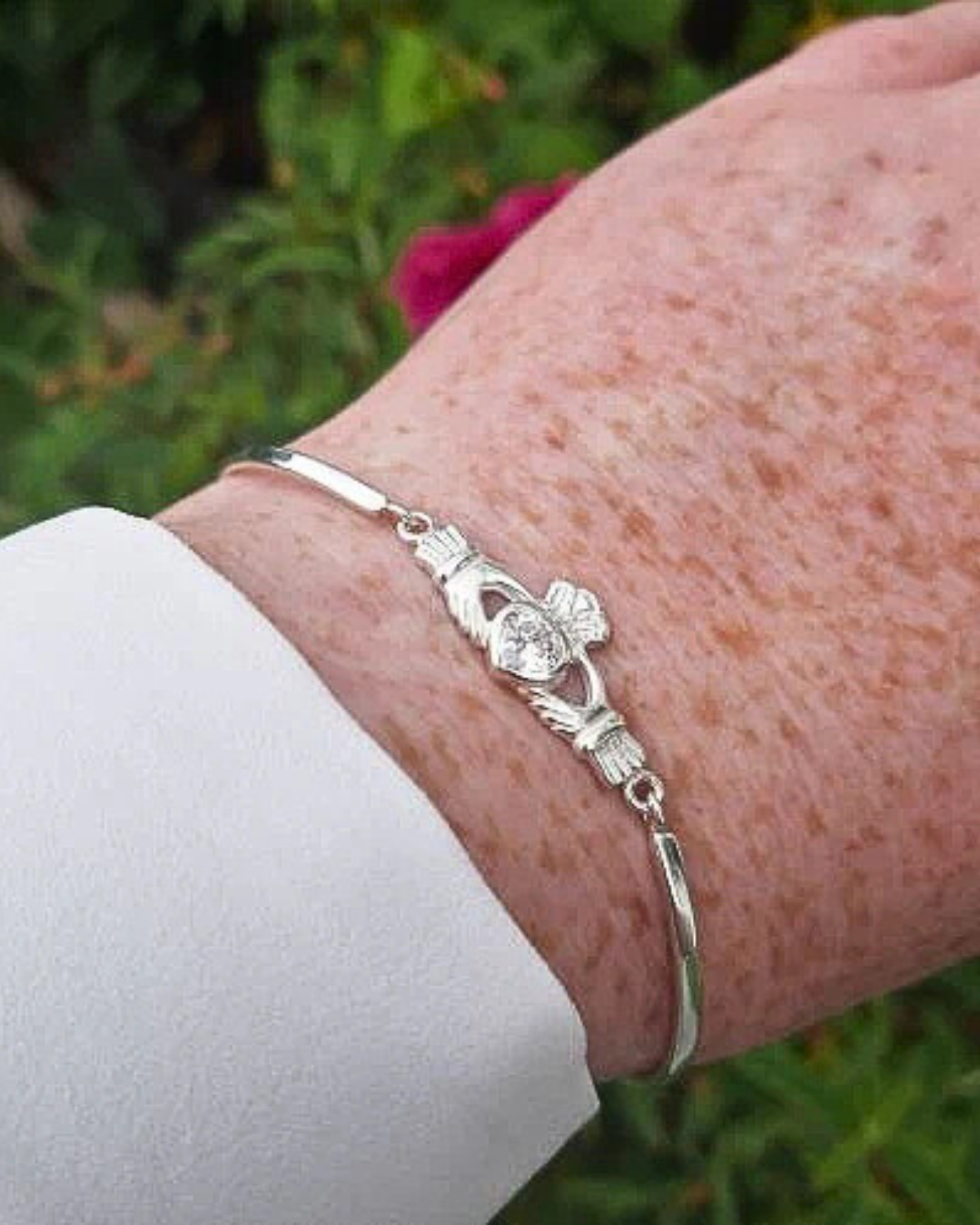 Claddagh Birthstone bangle-1Our stunning bangle-style birthstone Claddagh bracelet features gorgeous stone settings and a classic claddagh design for a truly special piece. Enhance your style and show your love for tradition with this must-have accessory.