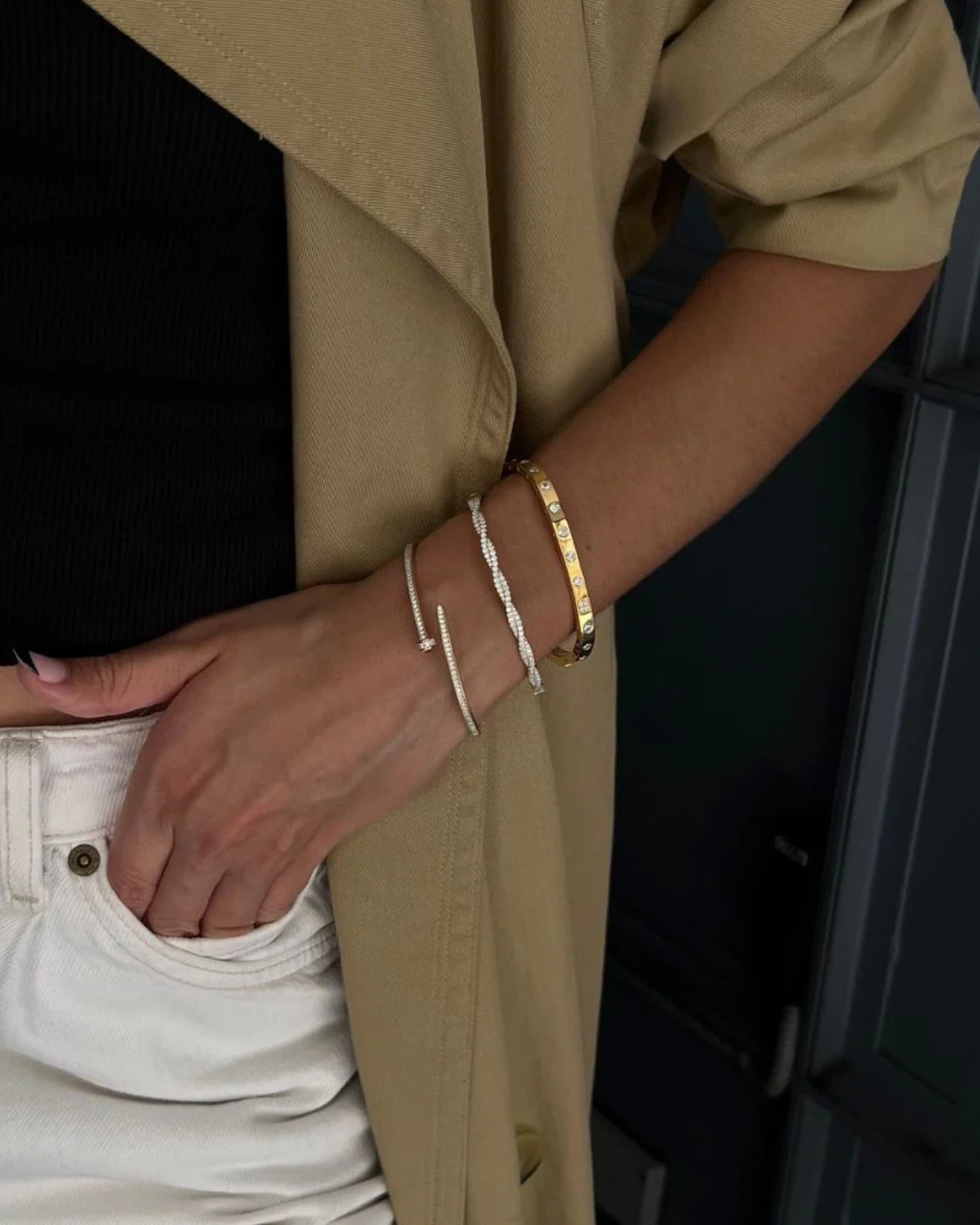 N5053This gold-plated CZ nail bangle adds edge to your bracelet stack and elevates your everyday look. Crafted from sterling silver and coated in a thick layer of 18ct gold, this gold bangle brings a modern feel to your wrist. A standout piece you’ll reach for daily.