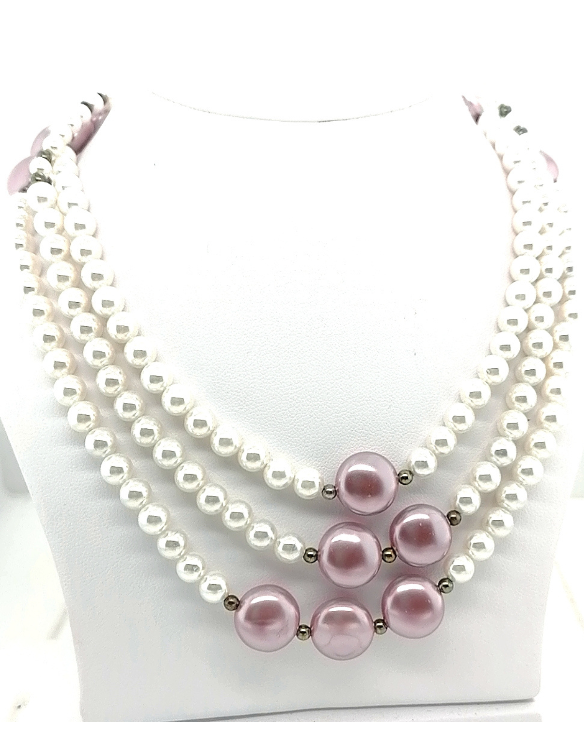 NKPR60Three lustrous strands of white pearls cascade at varying lengths, creating an elegant layered effect that flatters the neckline.