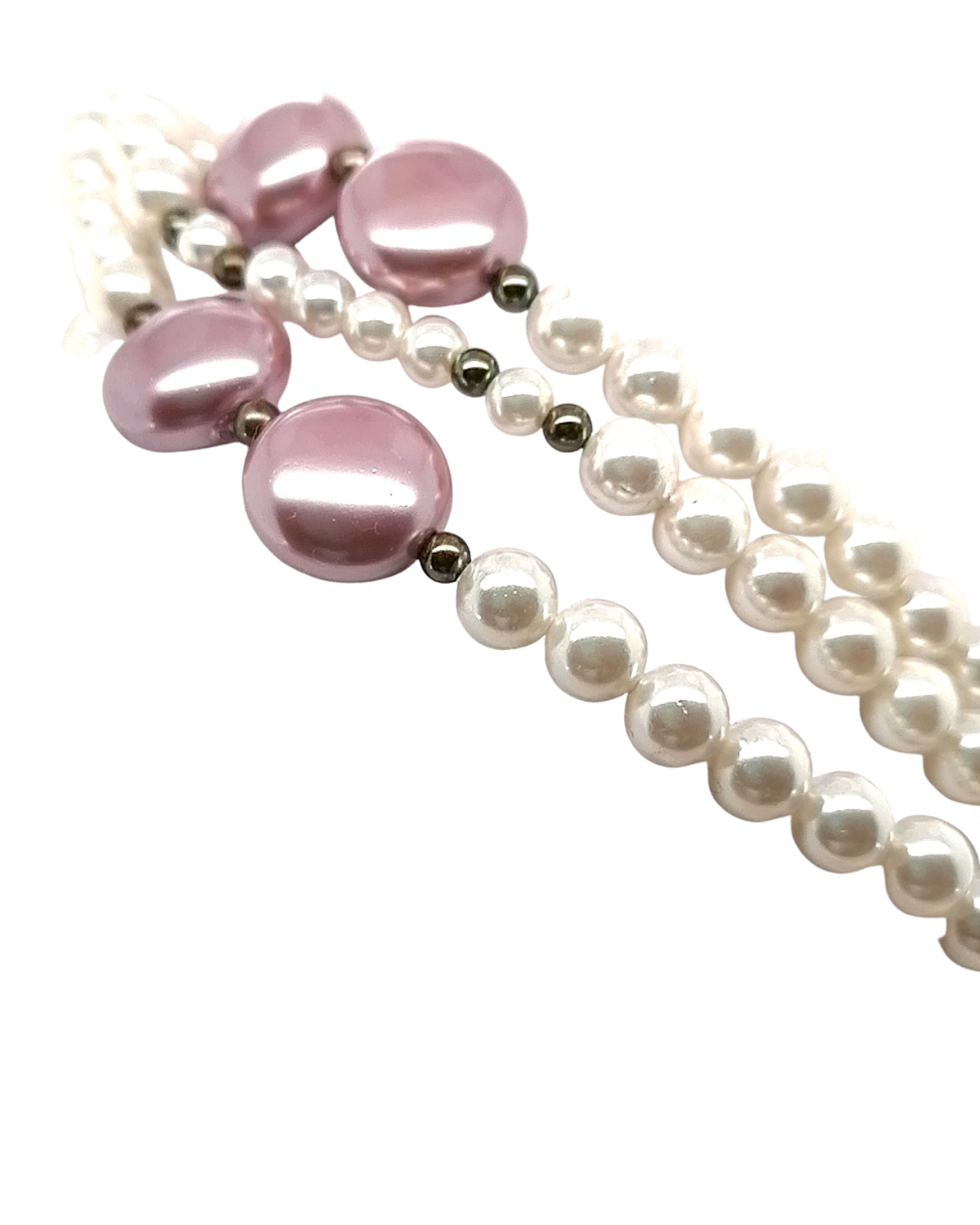 Delicate pink flat button pearls accent the design with subtle warmth and dimension. Secured by an ornate clasp, this 18-inch piece combines timeless sophistication with refined craftsmanship.