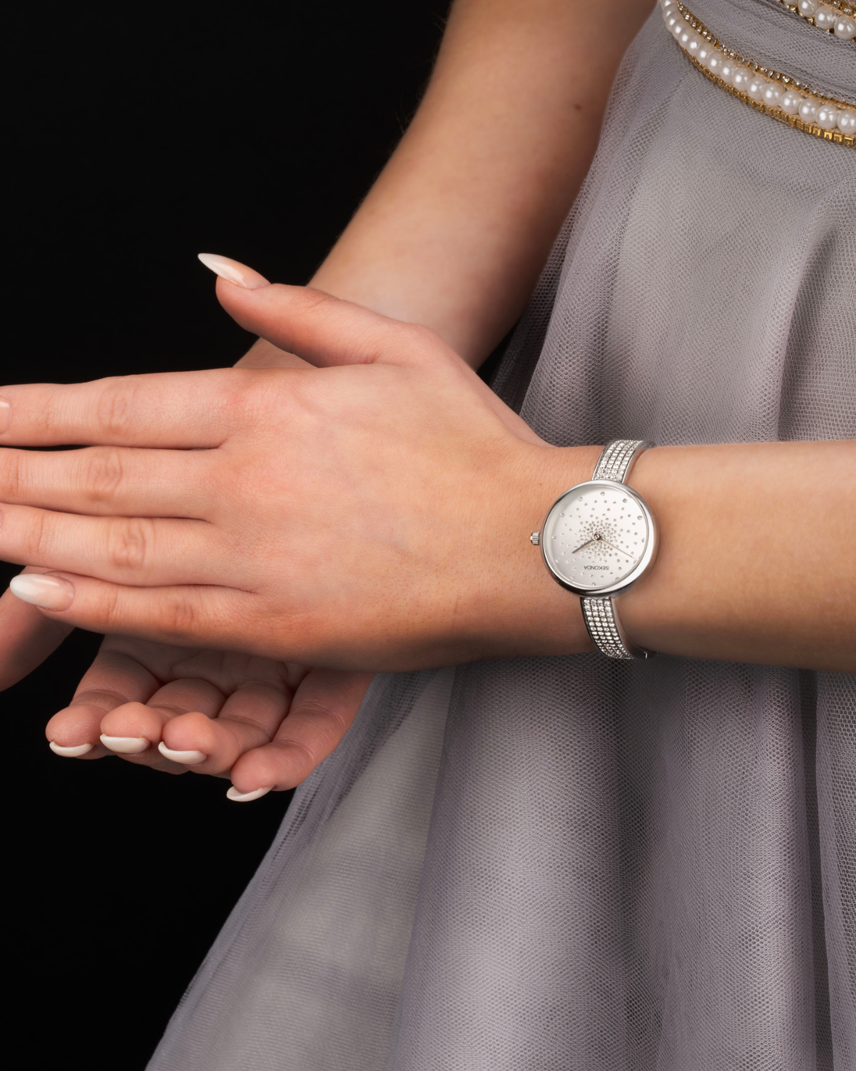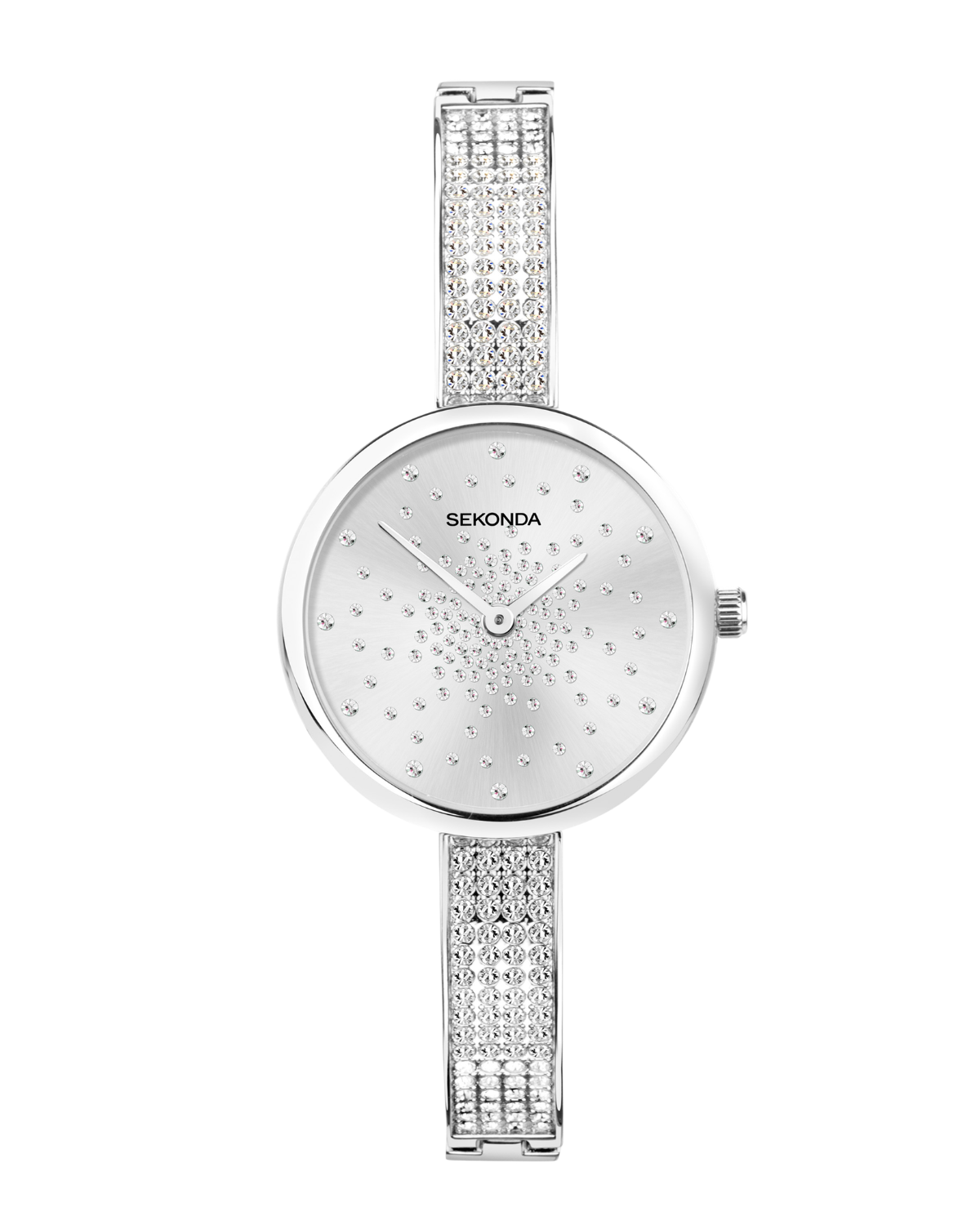 The watch has a round, ion-plated silver alloy case with a silver glitter dial, stone set with 130 crystals. The watch is fastened with an ion-plated silver brass semi-bangle bracelet, embellished with over 130 crystals.