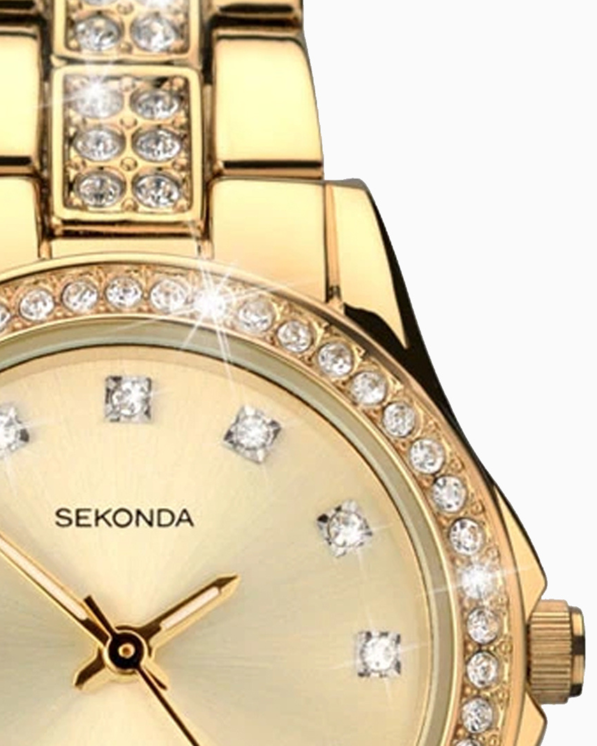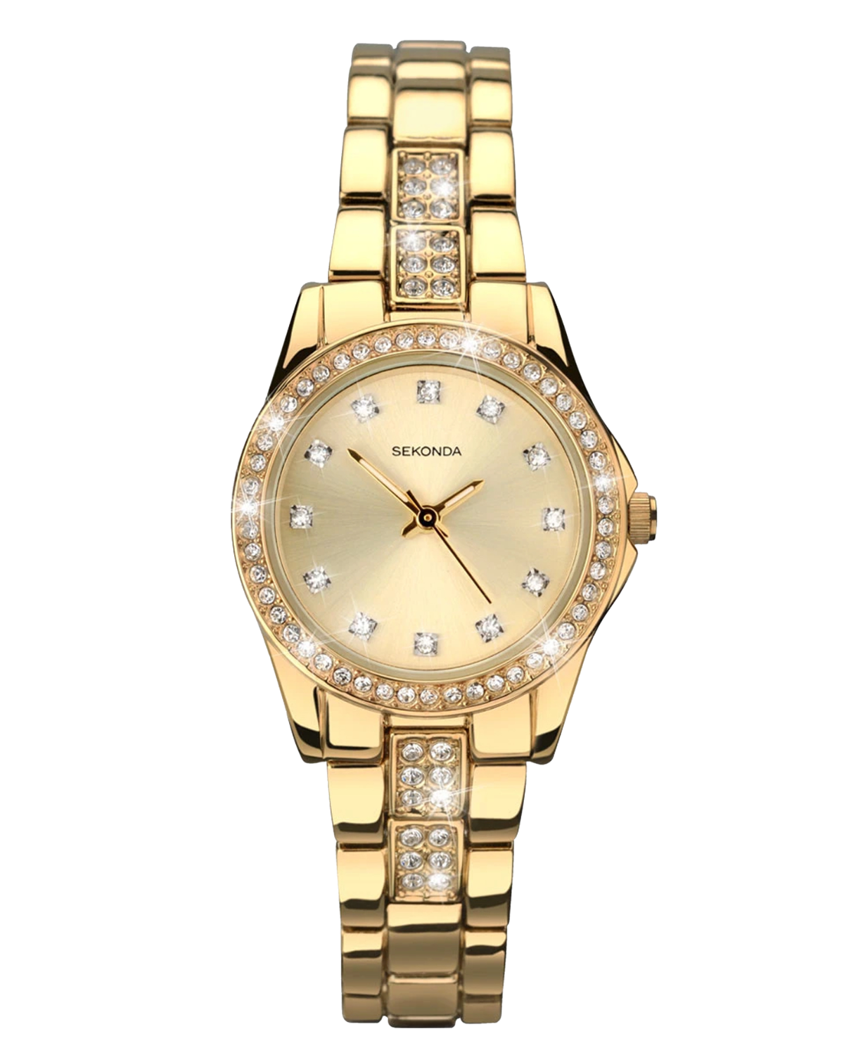 This timepiece features a gold plated stone set case housing a complementing champagne stone set dial. The watch is fastened with a matching gold plated stone set bracelet.