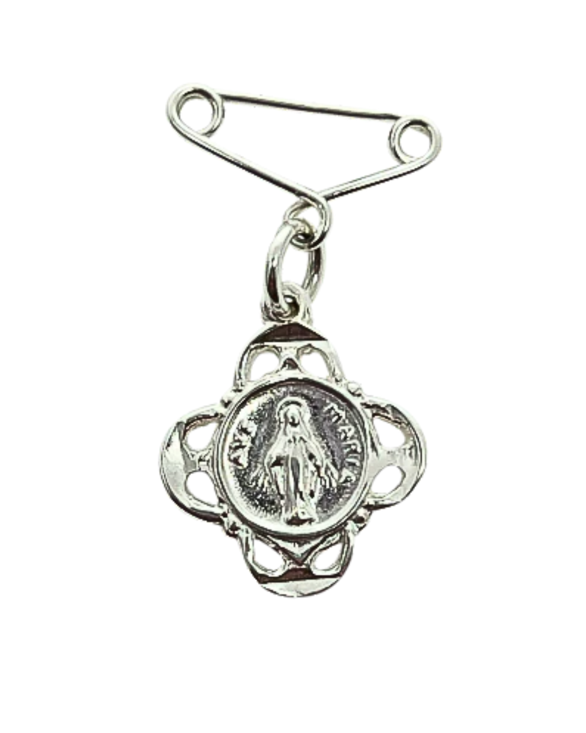 Round sterling silver Miraculous Medal with open cross styled detailed edging.  Ave Maria around  Mary.  It is also suitable to attach to a link bracelet or baby pin